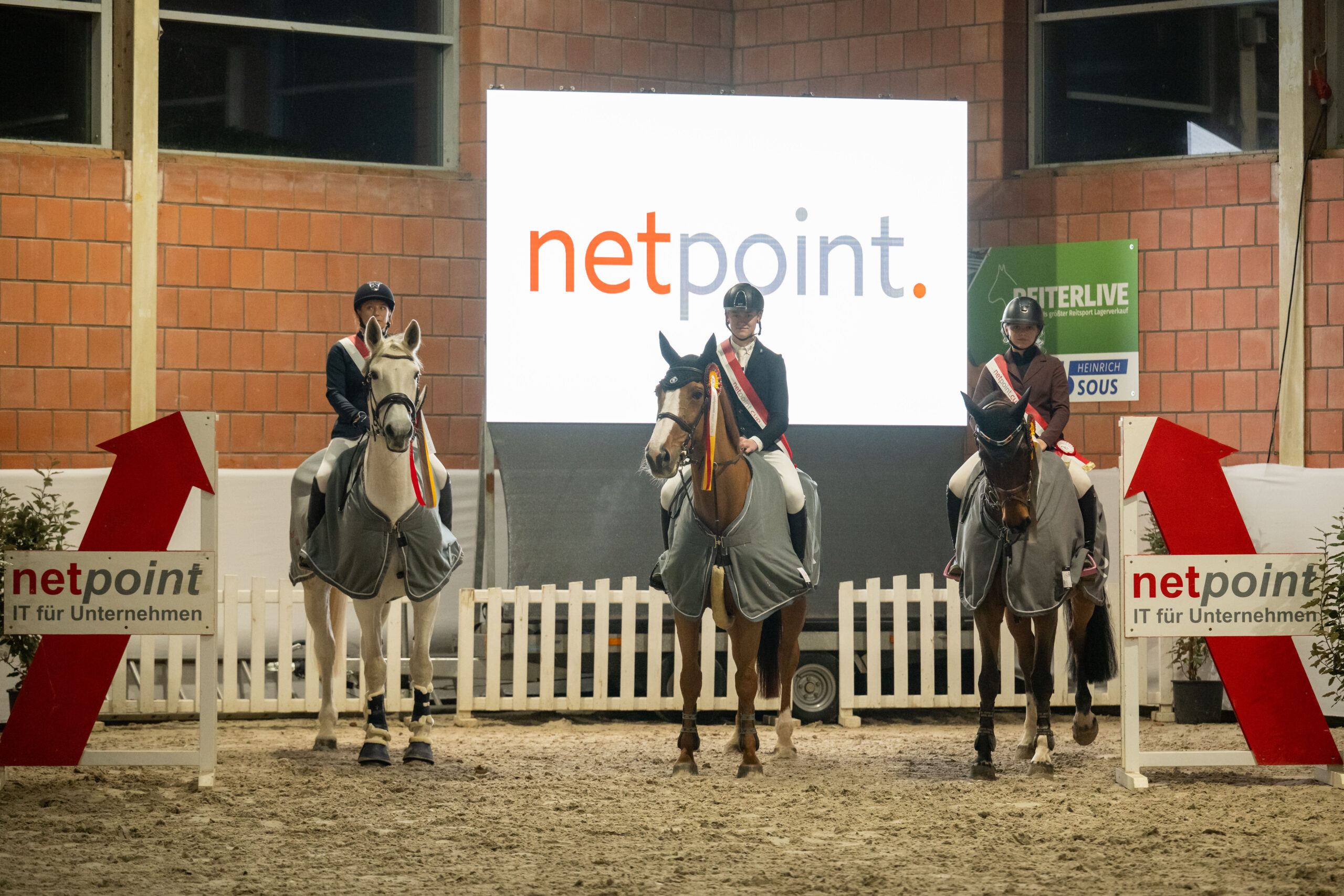 Wie im vergangenen Jahr gewann beim Netpointfinale der RV Graf Holk Grefrath im Springen und der RV Hubertus Anrath-Neersen in der Dressur. Im Springen lagen die Grefrather mit 1555,75 Punkten vor Anrath-Neersen und RFV Kempen-Schmalbroich/RV Graf Holk Grefrath auf den Plätzen zwei (1532) und drei (1530). In der Dressur behauptete sich Anrath-Neersen mit 1571 Punkten vor RZV Rheindahlen mit 1561,75 (der erstmals aus dem Pferdesportkreis Mönchengladbach dabei war) und RV Graf Holk Grefrath/RFV Kempen-Schmalbroich mit 1548,75 als Zweit- und Drittplazierte. Die Reitvereine wissen den Netpointcup zu schätzen, weil er mit Ehren- und Somderpreisen gut ausgestattet ist. Die Fotos sind von Leonie Minten: Das erste Foto zeigt die Springreiter des RV Graf Holk Grefrath und das zweite die Dressurreiter des RFV Hubertus Anrath-Neersen als jeweilige Netpointcupsieger.