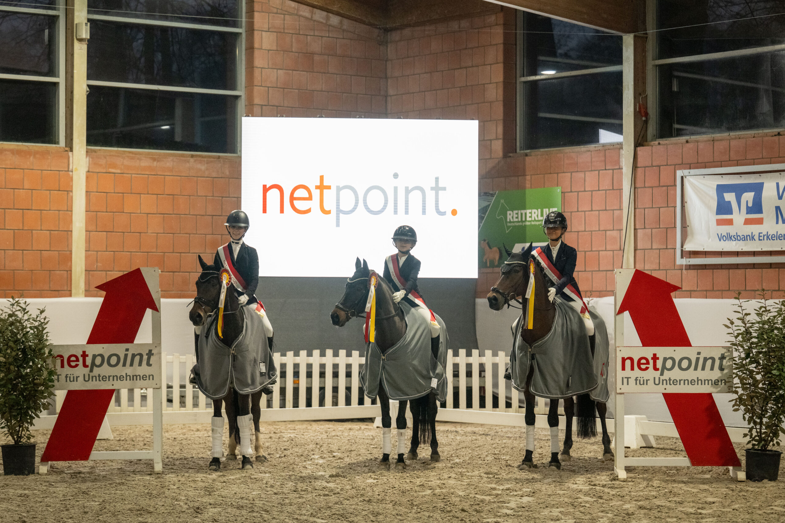 Wie im vergangenen Jahr gewann beim Netpointfinale der RV Graf Holk Grefrath im Springen und der RV Hubertus Anrath-Neersen in der Dressur. Im Springen lagen die Grefrather mit 1555,75 Punkten vor Anrath-Neersen und RFV Kempen-Schmalbroich/RV Graf Holk Grefrath auf den Plätzen zwei (1532) und drei (1530). In der Dressur behauptete sich Anrath-Neersen mit 1571 Punkten vor RZV Rheindahlen mit 1561,75 (der erstmals aus dem Pferdesportkreis Mönchengladbach dabei war) und RV Graf Holk Grefrath/RFV Kempen-Schmalbroich mit 1548,75 als Zweit- und Drittplazierte. Die Reitvereine wissen den Netpointcup zu schätzen, weil er mit Ehren- und Somderpreisen gut ausgestattet ist. Die Fotos sind von Leonie Minten: Das erste Foto zeigt die Springreiter des RV Graf Holk Grefrath und das zweite die Dressurreiter des RFV Hubertus Anrath-Neersen als jeweilige Netpointcupsieger.